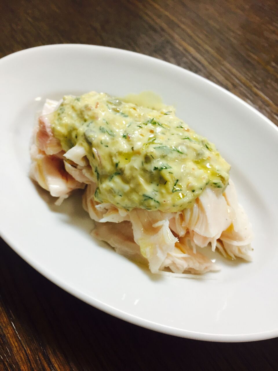 鶏むね肉を白ワインで蒸して、ハーブとビネガーをきかせたタルタルソース、ラビゴットソースをかけたシンプルなデリ。
