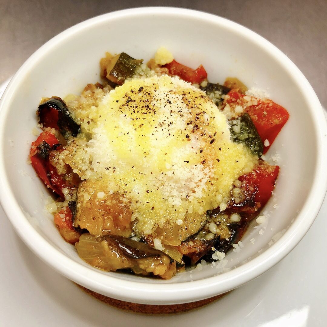 ナス、ズッキーニ、パプリカ、トマト、玉ねぎをローストして煮込み野菜の旨味を凝縮した南仏を代表する野菜の煮込み料理。